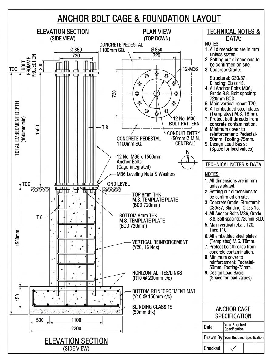 Foundation:Â Flange base with anchor bolts and template plate